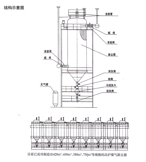 高爐煤氣干法脈沖袋式除塵器由荒煤氣主管來的荒煤氣(260度)經支管進入,袋式除塵器的下部箱休.